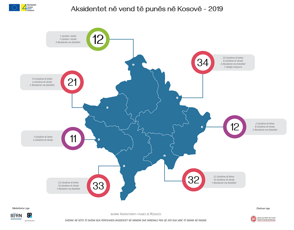 Gjatë vitit 2019 në vëndin e punës kanë ndodhur 240 aksidente me 226 punëmarrës të lënduar dhe 14 të vdekur.